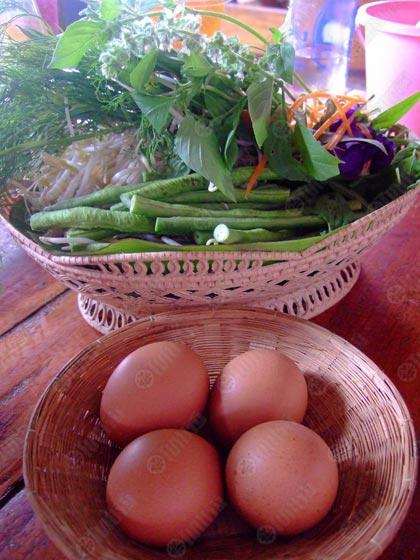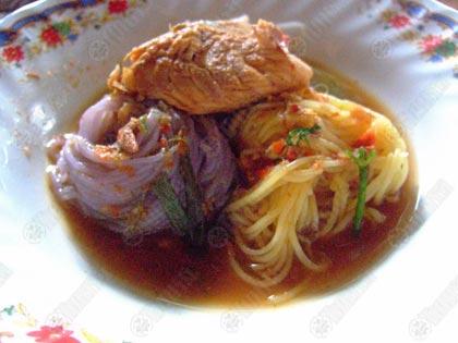 ขนมจีนร้านนี้จะขายเป็นชุด ในชุดมีขนมจีน 1 จาน หนึ่งจานมีขนมจีนม้วนเป็นก้อนๆพอดีหม่ำจำนวน 10 ก้อนคละมาครบ 7 สี พร้อมกับน้ำยา 3 หม้อ มีน้ำยากะทิ รสนุ่มละมุนละไม ใช้เนื้อปลาทับทิมคั่วกับเครื่องแกงที่ทางร้านทำเอง รสกลมกล่อมกำลังดี เร่งดีกรีขึ้นอีกนิดกับ น้ำยาป่า รสเข้ม แซมด้วยกลิ่นปลาร้าอ่อนๆ ราดชุ่มๆ โซ้ยกับผักสดๆ และไข่ต้มอร่อยขาดใจ ปิดท้ายด้วย น้ำพริก รสเปรี้ยวอมหวานกำลังดี ใส่พริกคั่วลงไปสักนิด เติมน้ำปลาอีกหน่อยอร่อยจนไม่อยากกลับบ้าน (หุหุ) แถมท้ายด้วยผักสารพัดชนิดทั้ง กะหล่ำปลี ถั่วงอก ถั่วฝักยาว สะระแหน่ ผักชีลาว ใบแมงลัก ใบสนิว ใบพลูคาว และยอดผักแพว ผักทุกชนิดไม่ได้ใช้สารเคมีเพราะพี่บุญมีปลูกเองอยู่รอบบ้าน โซ้ยได้สบายใจ ทั้งน้ำยาและผักเติมได้ไม่มีอั้น “เราให้อย่างนี้ตลอดค่ะ ถ้าน้ำยาหมด ผักหมดเราก็เติมให้ฟรีไม่คิดตังค์เพิ่มค่ะ คิดแต่ขนมจีนอย่างเดียว ผักร้านเราเยอะ เป็นผักพื้นบ้านทั้งนั้น เราปลูกเอง สด ใหม่ และอร่อยด้วยหอมลูกค้าส่วนใหญ่จะชอบค่ะ”