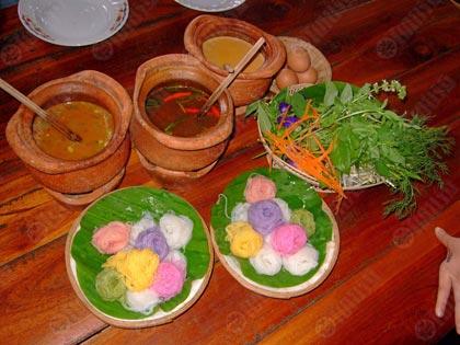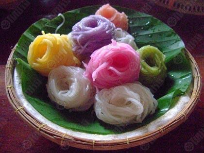 มหกรรมแห่งการใส่สีลงในเส้นขนมจีนไม่ใช่เรื่องง่ายๆ ต้องใช้ความใจเย็นเป็นที่ตั้ง ทั้ง 7 สี มีที่มาต่างกัน สีขาวเป็นขนมจีนธรรมดา คล้ำขึ้นมาหน่อยเป็นขนมจีนข้าวกล้อง สีเหลืองมาจากฟักทอง สีม่วงดอกอัญชัน สีชมพูอ่อนจากแก้วมังกร สีส้มจากแครอทผสมน้ำแตงโม และสีเขียวจากใบเตย