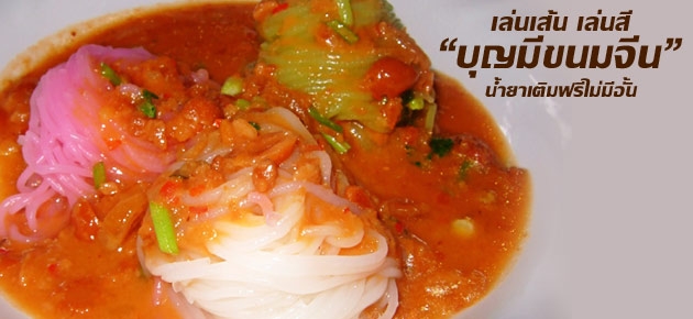 “เปิดมา 14 ปีแล้วค่ะ ก่อนหน้านี้ทำต้นไม้ขายมาก่อน พอเงินบาทลอยตัวก็ขายไม่ดี ก็เลยเปลี่ยนมาขายขนมจีนแทน แต่ว่าก่อนหน้านี้ก็คือหาบขายมาก่อนอยู่แล้ว ก็เลยเปลี่ยนจากหาบเร่ขายมาเปิดร้านค่ะ ร้านก็อยู่ตรงนี้มาตลอด ตอนแรกก็ไม่ได้มีโต๊ะเยอะขนาดนี้ มีแค่ 4 โต๊ะเอง แล้วตอนหลังก็ค่อยๆ ขยับขยาย สูตรที่ทำก็เป็นสูตรของที่บ้านทำทานกันอยู่แล้ว” ขนมจีนร้านนี้นอกจากเส้นจะเล็กไม่เหมือนใคร ยังมีสีสันสดใส คุณพี่บุญมีใช้ผักผลไม้และดอกไม้ที่ปลูกเองในสวนมาใช้ให้เกิดประโยชน์ “ที่ทำขนมจีนหลายๆสีก็เพราะเรามีต้นไม้ที่เราปลูกเองที่นี่ เพราะเราเคยทำสวนมาก่อน เราก็เลยคิดว่าเอาที่เราปลูกมาทำสีให้ขนมจีนดีกว่า ทำมาแล้วลูกค้าก็ชอบ เราก็ทำเพิ่มขึ้นมาเรื่อยๆ จนตอนนี้มี 7 สีแล้วค่ะ”