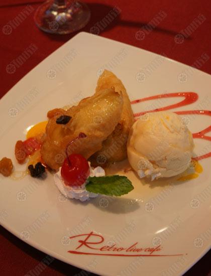 ปิดท้ายด้วยของหวานทานง่ายอย่างกล้วยหอม ซึ่งนำมาชุปแป้งทอดราดด้วยซอสสูตรทางร้านทานคู่กับไอศกรีมวนิลา รสชาติหวานกำลังดี.