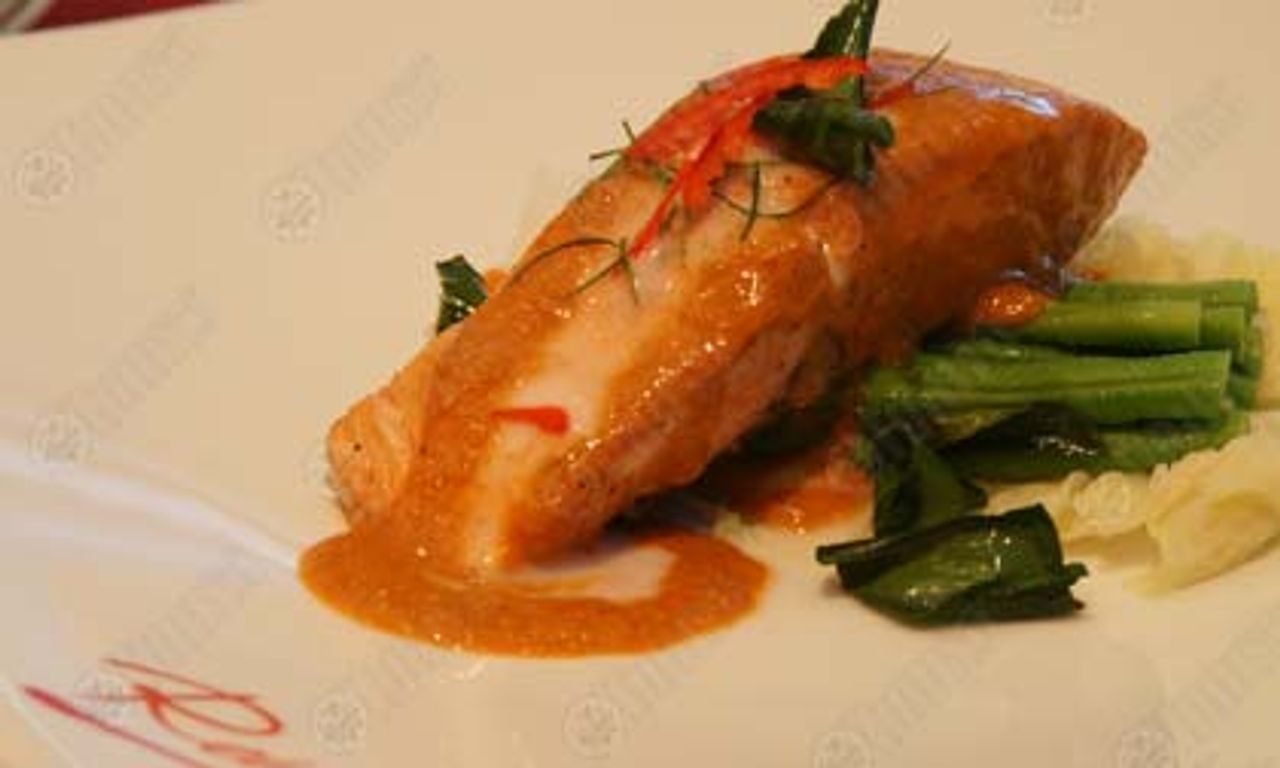 อีกเมนูสำหรับสาวๆ ที่ชอบทานปลาแซลมอน ที่นี่นำมาประยุกต์เป็น 'ฉู่ฉี่ปลาแซลมอน' ได้รสชาติแบบไทยๆ ที่กลิ่นของพริกแกง แต่ไม่เผ็ดจนเกินไป ซึ่งเข้ากันได้ดีกับเนื้อปลาแซลมอน ที่ส่งตรงจากนอร์เวย์มาเลย จานนี้ทานแล้วไม่ต้องห่วงเรื่องน้ำหนัก แถมยังได้ประโยชน์ไปเต็มๆ