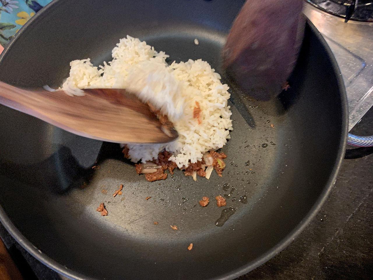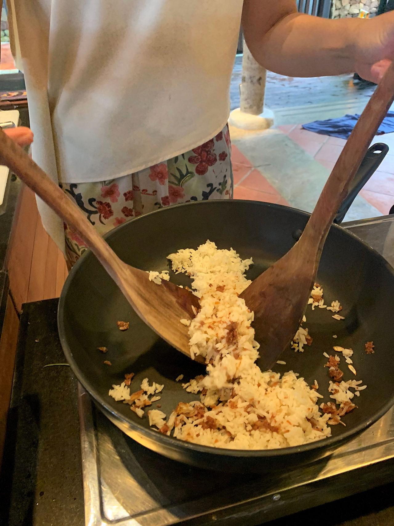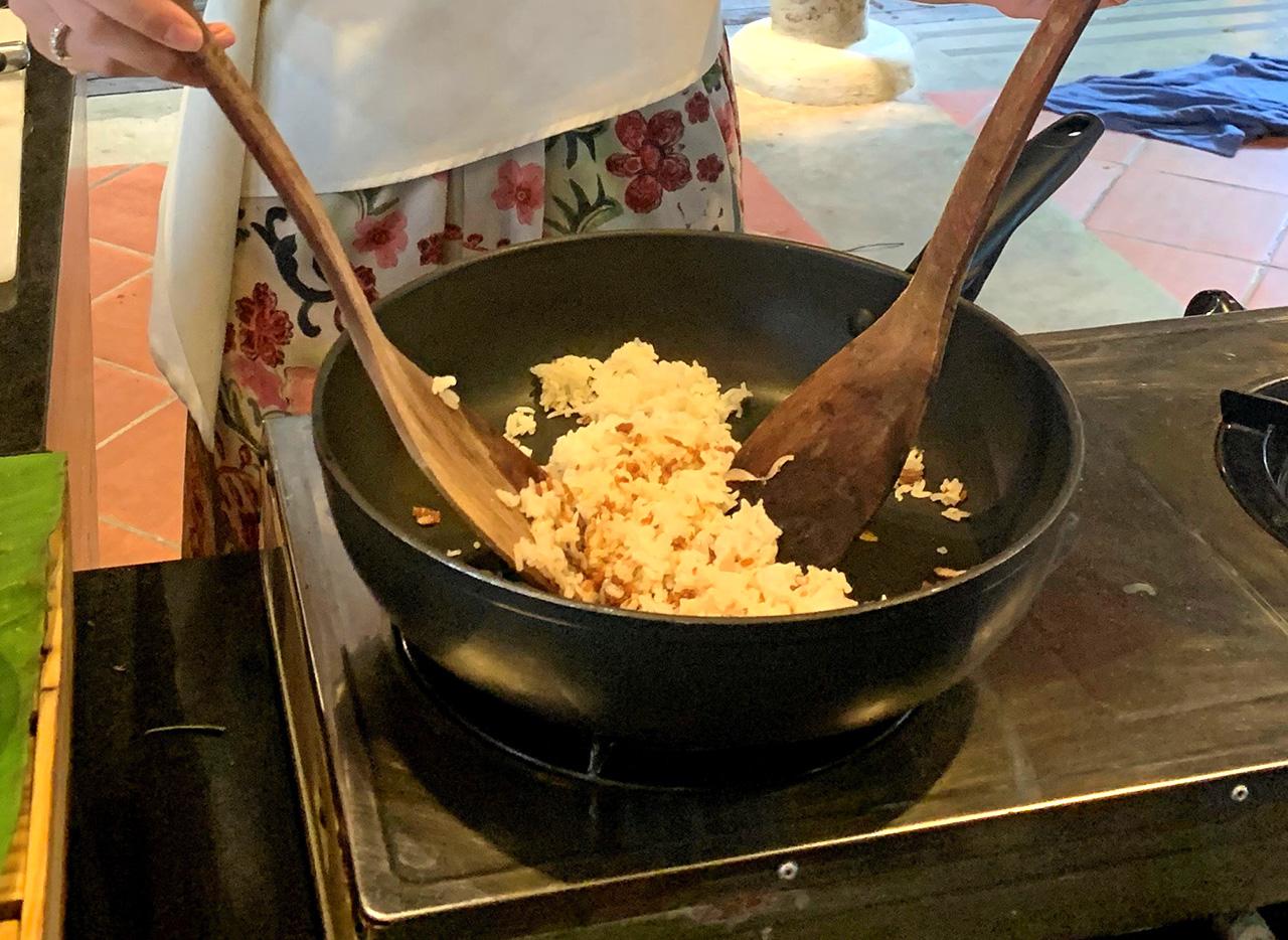2) ใส่ข้าวหุงสุกลงไปคลุกกับกะปิ ใช้ไฟแรงผัดให้เข้าเป็นเนื้อเดียวกัน จากนั้นตักข้าวคลุกกะปิพักทิ้งไว้