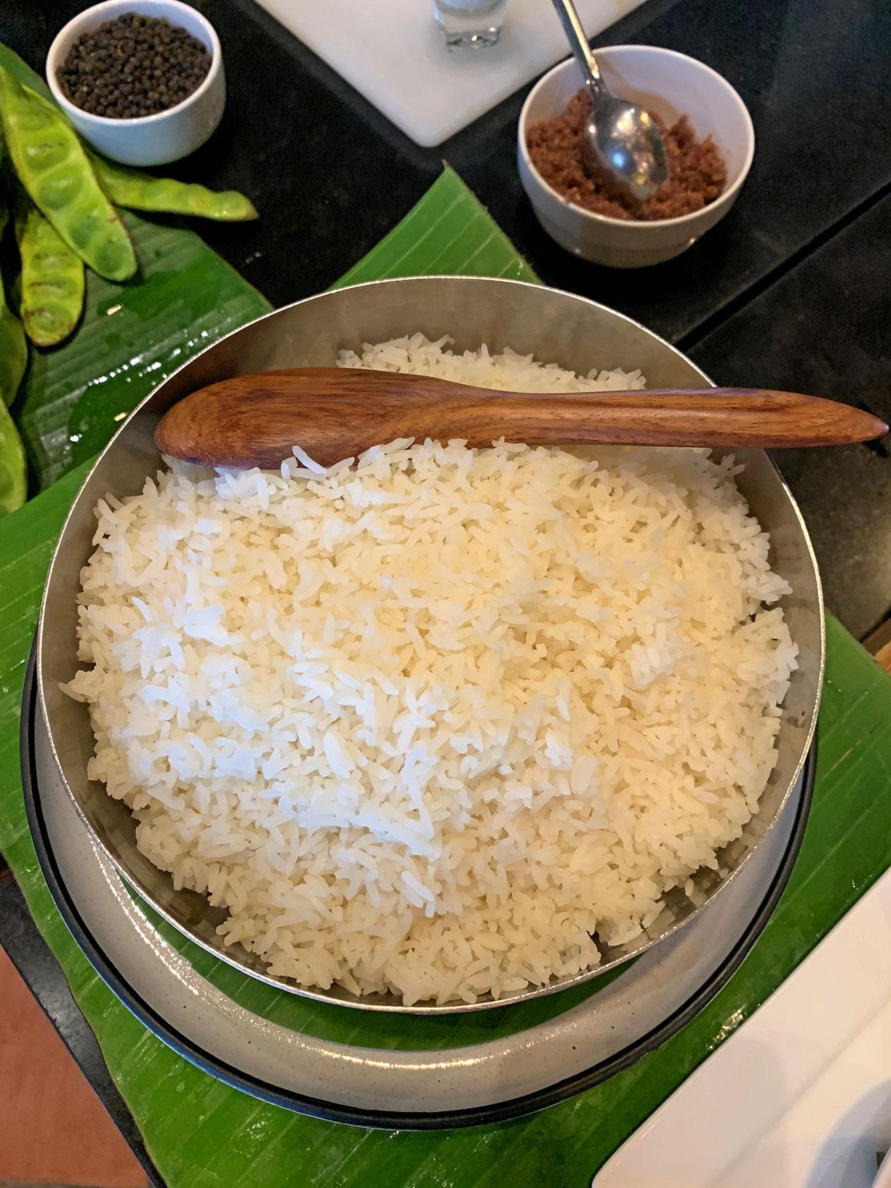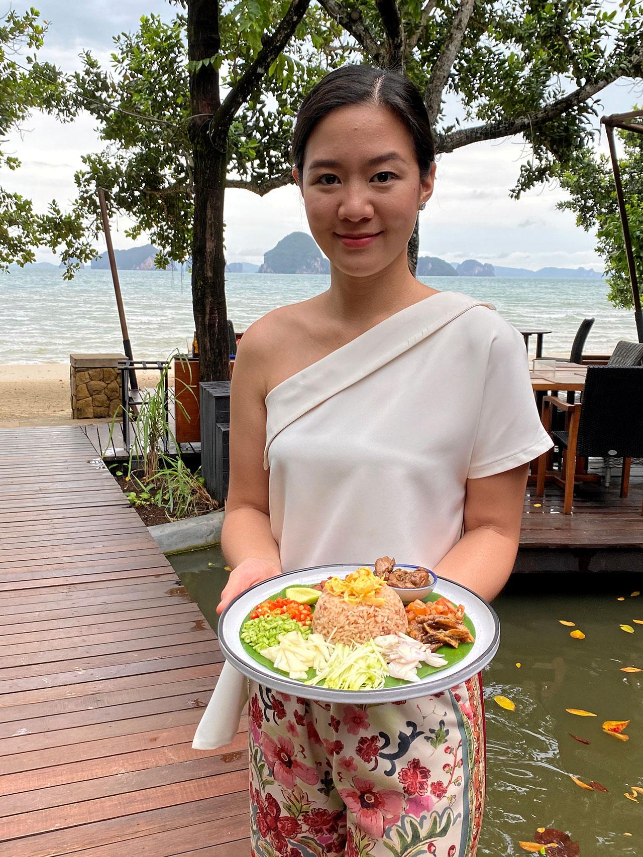 เดอะ ทับแขก กระบี่ นอกจากเด่นเรื่องที่พักสวยงาม หาดทรายงดงามแล้ว เรื่องอาหารยังเป็นดาวเด่นที่หลายคนเอ่ยปากชม ซึ่ง คุณแจน บอกว่า อาหารที่โรงแรมพยายามที่จะใช้วัตถุดิบจากท้องถิ่นไม่ว่าจะเป็นปลา เป็นผัก ซึ่งทางใต้มีความอุดมสมบูรณ์ ในส่วนของปลาก็ซื้อจากประมงที่ออกหาปลาหน้าโรงแรม ส่วนผักก็อุดหนุนทั้งชาวบ้านและพนักงานที่ปลูกผักเป็นอาชีพเสริม ซึ่งล้วนปลอดสารเคมีทั้งสิ้น เมนูของโรงแรมบางวันจึงแปรเปลี่ยนไปตามฤดูกาล แต่เมนูยอดฮิตที่ติดใจทุกคน คือ “ข้าวคลุกกะปิ” ที่ออกทุกรอบ เช้า กลางวัน เย็น เลยทีเดียว พร้อมกันนี้ได้มาแชร์วิธีการทำเมนูยอดฮิตนี้มาให้ลองทำกันดูด้วย