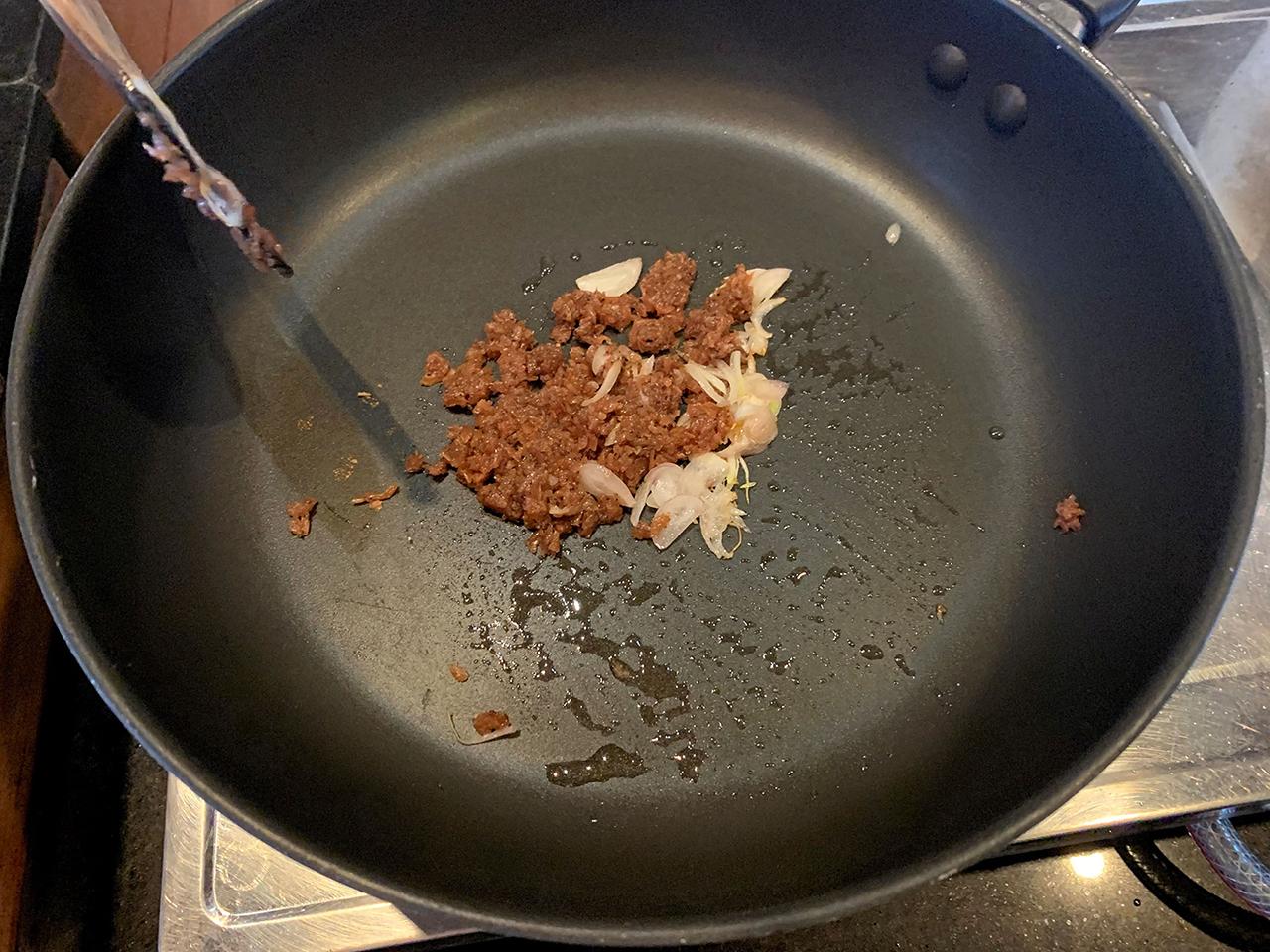 1) ตั้งกระทะใส่น้ำมัน เปิดไฟอ่อนๆ นำกะปิเคย จังหวัดกระบี่ ลงไปรวนให้พอสุกและส่งกลิ่นหอม