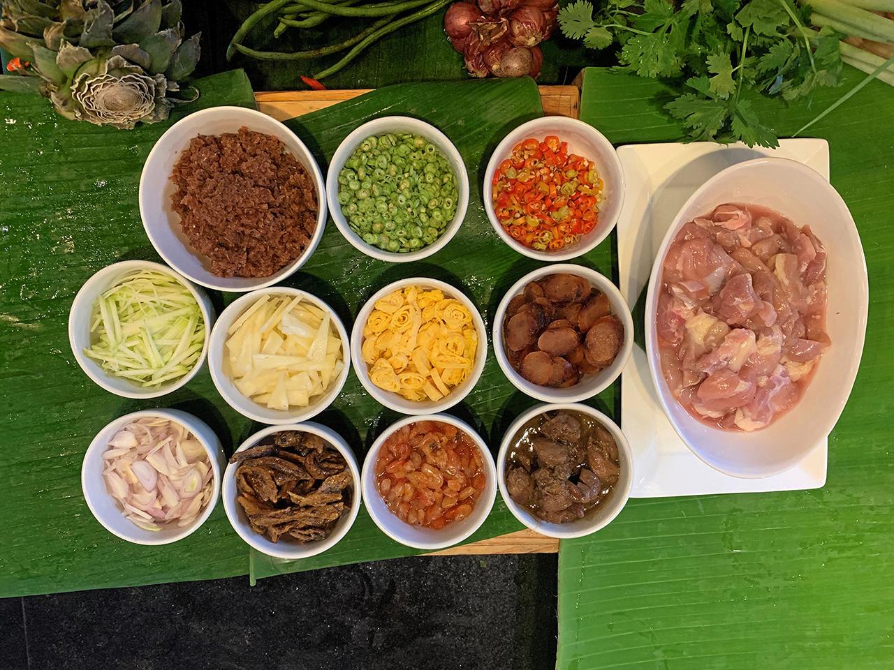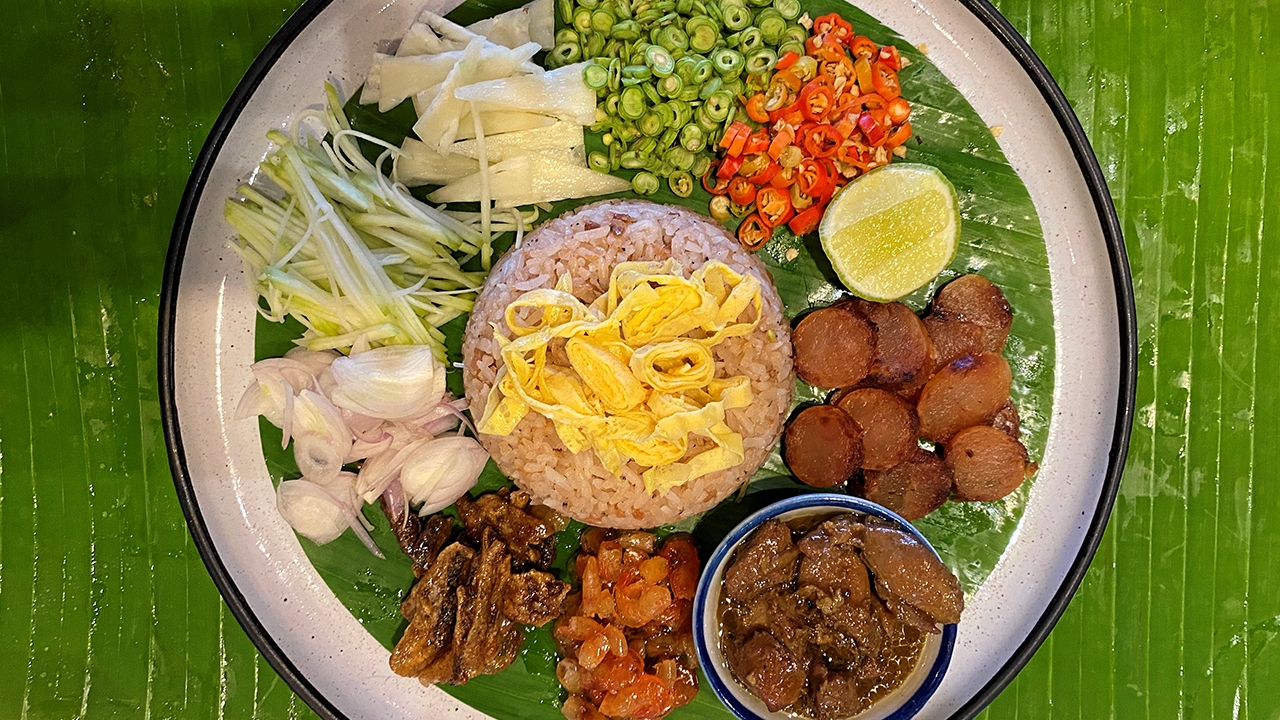 5) ตักข้าวคลุกกะปิใส่จาน เสิร์ฟพร้อมเครื่องเคียง 10 อย่าง มาครบทั้งไก่หวาน, กุนเชียงไก่ทอด, กุ้งหวาน, ปลาฉิ้งฉ้างทอดกรอบ, ไข่เจียวฝอย, พริกขี้หนูซอย, ถั่วฝักยาวซอย, สับปะรดซอย, มะม่วงซอย และหอมแดงซอย.