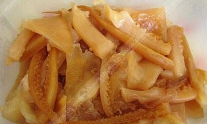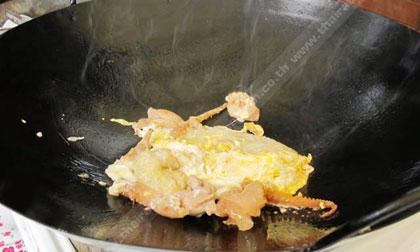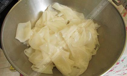 วิธีทำ 1) หั่นไก่ขนาดพอคำ ปริมาณ 1/2 กก. นำไปหมักกับซีอิ๊วขาว, น้ำมันหอย, น้ำตาลทราย อย่างละ 1/2 ชช. และน้ำมันพืช 1 ชช. จากนั้นแช่ตู้เย็นไว้ 1 คืน เพื่อให้เนื้อไก่นุ่มและเครื่องปรุงซึมเข้าเนื้อ แต่ถ้าไม่มีเวลาควรจะหมักให้ได้อย่างน้อย 2 ชม. 2) ตั้งกระทะบนเตาให้ร้อน จึงใส่น้ำมัน 1 ชต. รอจนน้ำมันร้อนดีค่อยใส่ไก่หมักประมาณ 80 กรัม และกระเทียมลงพร้อมกัน ผัดจนไก่ใกล้สุก 3) ใส่เส้นลงไปประมาณ 100 กรัม ผัดจนเส้นมีกลิ่นหอม จึงใส่ปลาหมึกกรอบประมาณ 5-6 ชิ้น และเติมน้ำมันอีก 1 ชช. และตอกไข่ลงไปผัดให้เข้ากัน 4) ปรุงรสด้วยซีอิ๊วขาว น้ำมันหอย น้ำตาลทราย และตังฉ่ายสับอย่างละ 1 ชช. ก่อน ตักขึ้นจากกระทะ ค่อยใส่ต้นหอมซอย และตักใส่จานที่รองด้วยผักกาดหอม พร้อมกับโรยพริกไทยก่อนเสิร์ฟ