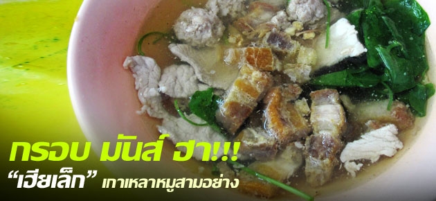 ร้าน “เฮียเล็ก เกาเหลาหมูสามอย่าง” เป็นขวัญใจขาโซ้ยทุกเพศทุกวัย ตั้งแต่รุ่นใหญ่ลายคราม ยันรุ่นเล็กหน้าใสวัยกรุบกริบ (หุหุ) ตำนานความอร่อยเริ่มต้นมาตั้งแต่ปี 2506 คุณเตี่ยของเฮียเล็กบุกเบิกเปิดเตา ตั้งหม้อต้มน้ำซุปให้นักหม่ำได้โซ้ยแอนด์ซดเพิ่มความสดชื่นระหว่างช็อปปิ้ง และทิ้งสูตรลับฉบับครอบครัวไว้ให้เฮียเล็กดูแลกิจการต่อมา จนกระทั่งตลาดพาหุรัดถูกทุบทิ้ง เฮียต้องหิ้วหม้อ หอบเตา ไปเริ่มต้นใหม่ที่ถนนเอกชัย ขายได้ประมาณ 3 ปี มีเหตุต้องโยกย้ายอีกครั้งอย่างกะทันหัน เป็นการย้ายนอกโพยโดยไม่ได้ร่ำลาลูกค้าขาประจำ ต้องเริ่มต้นนับหนึ่งใหม่ด้วยหัวใจที่แกร่ง ฝีปากที่ก๋ากั่นเหมือนเดิม