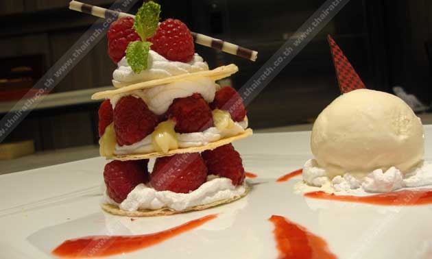 ปิดท้ายด้วย ส่วนผสมของราสเบอร์รี่ซอส : ราส-เบอร์รี่แช่แข็ง/ น้ำตาลทราย/ น้ำเปล่า/ แป้งข้าวโพด ......วิธีทำ 1) ต้มราสเบอร์รี่แช่แข็ง แล้วใส่น้ำตาลทราย น้ำเปล่า รวมกัน ใช้ตะกร้อมือคนจนเดือด 2) ใส่แป้งข้าวโพดที่ละลายกับน้ำเปล่าคนให้เข้ากันพอเดือด ยกลง เมื่อได้ส่วนผสมครบแล้วก็นำมาตกแต่งโดยวางแผ่นแป้งและบีบคัสตาร์ด–ครีม ตกแต่งด้วยราสเบอร์รี่สด และราดด้วยราสเบอร์รี่ซอส เพิ่มความสวยงามด้วยวิปปิ้ง ครีม และแผ่นช็อกโกเลต ก็จะได้ “Mille Feuille” (มิลย์ เฟย) ที่หวาน มัน กรอบ ทานคู่กับไอศกรีม ยิ่งเพิ่มรสชาติความอร่อยยิ่งขึ้น.