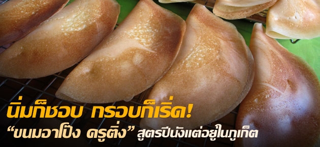 เฉลย...อาโป๊ง คือ แป้งที่ทอดในกระทะใบเล็กๆ ทอดแบบไม่ใช้น้ำมัน ทำกระทะละหนึ่งชิ้น กินร้อนๆอร่อยมั่กๆ!! รสชาติละม้ายคล้ายแพนเค้กบวกกับทองม้วน มีกลิ่นหอมยั่วยวนชวนโซ้ย อาโป๊งของภูเก็ตโดยทั่วไปจะเป็นแป้งแผ่นบางๆ ม้วนเป็นแท่งคล้ายทองม้วน แต่กรอบน้อยกว่า บางร้านอาจจะมีไส้ บางร้านอาจจะไม่มี แต่อาโป๊งที่เจ๊แซบขอแนะนำในวันนี้ เป็นสูตรปีนัง ไม่เหมือนใคร ชื่อร้าน “อาโป๊งครูติ่ง” ทายาทตัวจริงที่สืบทอดสูตรอาโป๊งประจำตระกูลที่มีมาตั้งแต่รุ่นย่าทวด