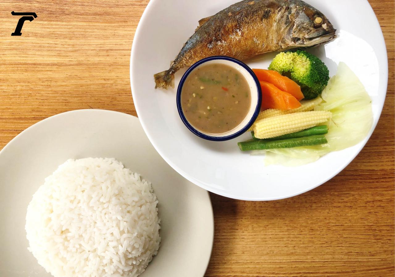 4) นำปลาทูอีกครึ่งตัววางลงไปบนข้าวสวย ตกแต่งด้วยผักต้ม ...เพียงเท่านี้ข้าวแมวน้ำพริกกะปิก็พร้อมรับประทานแล้ว