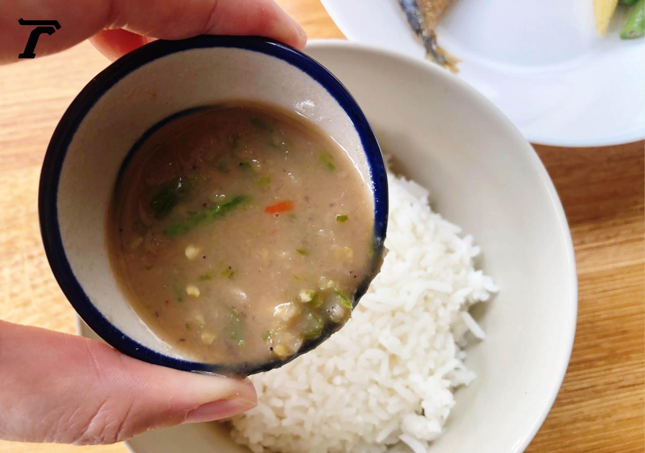 2) เทน้ำพริกกะปิใส่ข้าวสวย