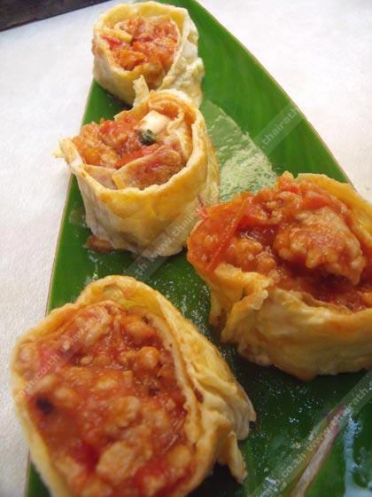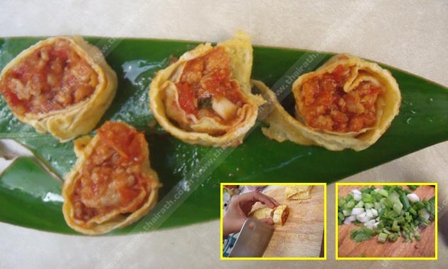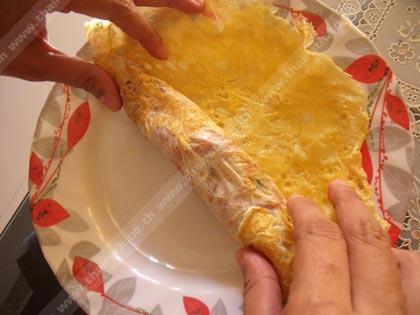 4. นำน้ำพริกอ่องตักใส่บนแผ่นไข่ จากนั้นม้วนจนหมดแผ่น