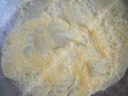 2. ตั้งกระทะให้ร้อนโดยไม่ต้องใส่น้ำมัน จากนั้นเทไข่ที่ตี และหมุนกระทะเป็นวงกลม ให้ไข่กลิ้งไปรอบๆกระทะ