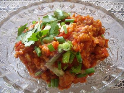 4. ใส่หมูสับลงตาม ผัดจนสุก จากนั้นตามด้วยมะเขือเทศที่หั่นเต๋า เพื่อให้สุก และเละเร็วขึ้น