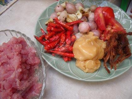 สำหรับใครที่ยังทำน้ำพริกอ่องไม่เป็น วันนี้ขอย้ำให้อีกรอบ ซึ่งวัตถุดิบมีดังนี้ หมูสับ, หอมแดง, กระเทียม, พริกแดง, น้ำตาลปี๊บ, น้ำมะขามเปียก, น้ำปลา, ต้นหอม และมะเขือเทศ