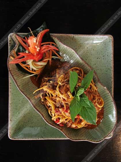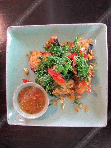 เมนูแรกสุดแซบกระแทกใจเจ๊แซบคือ “ผัดทะเลสมุนไพร” แค่อ่านชื่อน้ำลายก็สอออเต็มปาก ยิ่งได้กลิ่นหอมของเครื่องเทศลอยมาเตะจมูกตั้งแต่อาหารยังไม่มาวางที่โต๊ะ น้ำลายยิ่งพานจะไหล ทั้งกุ้ง ปลาหมึก ปลา ซ้ดสด ทอดพอสุก เนื้อเป็นสีเหลืองทอง ผัดกับเครื่องต้มยำสมุนไพร ทั้งตะไคร้ พริก กระเทียม กระชาย ข่า และใบมะกรูด ผัดไฟแรง ปรุงรสให้กลมกล่อม กินกับข้าวสวยร้อนๆอร่อยล้ำ