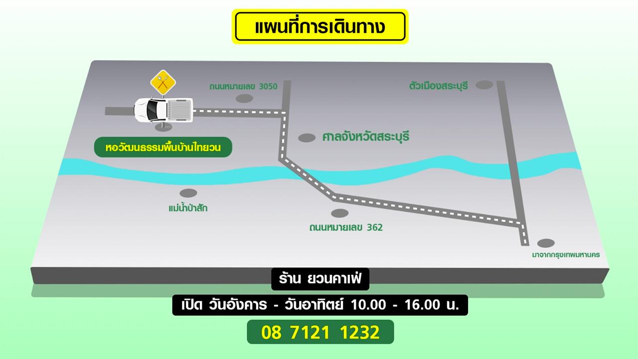 พิกัดร้าน : จากกรุงเทพมหานคร ใช้ทางเลี่ยงเมืองสระบุรีด้านตะวันตก ไม่ต้องเข้าตัวเมืองสระบุรี ใช้ถนนหมายเลข 362 ขับไปเรื่อยๆ จนผ่านหน้าศาลจังหวัดสระบุรี จากนั้นให้เลี้ยวซ้ายไปทางถนนหมายเลข 3050 ขับตามทางไปเรื่อยๆ ประมาณ 2 กิโลเมตร ก็จะถึงหอวัฒนธรรมพื้นบ้านไทยวน ซึ่งเป็นที่ตั้งของร้านยวนคาเฟ่แล้ว