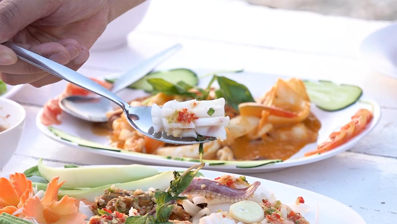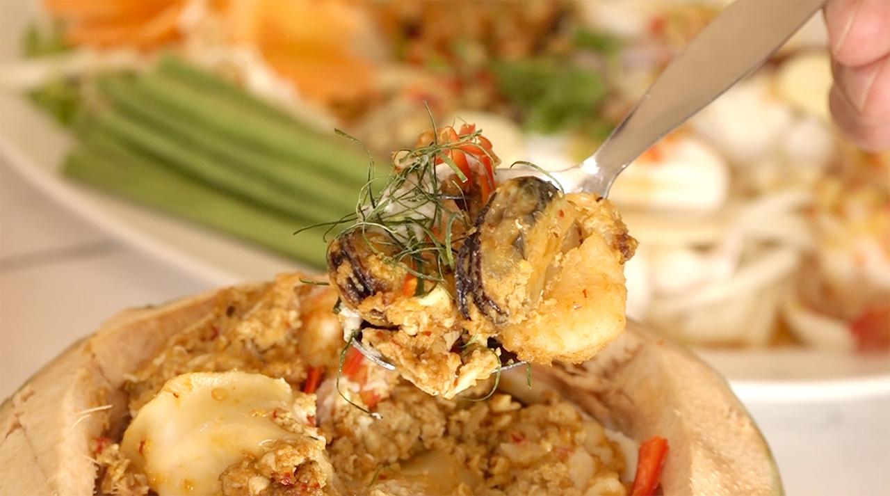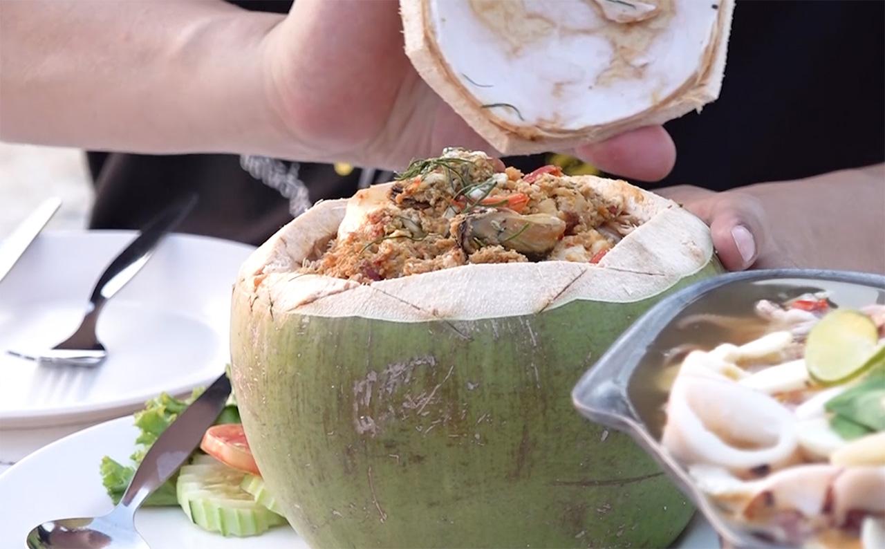 ที่ร้านจะมีเมนูซิกเนเจอร์ก็คือ ห่อหมกมะพร้าวอ่อน, กุ้งทอดซอสมะขาม เราใช้เป็นกุ้งแชบ๊วยทอดให้กรอบ ราดด้วยน้ำซอสมะขาม 3 รส และเมนูสุดท้ายคือ ยำ Sound of the sea