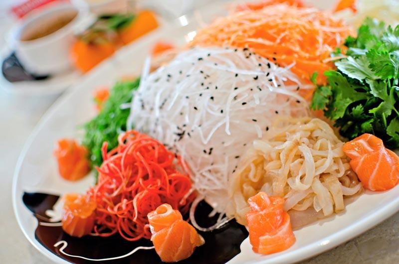 สำหรับครอบครัวคนจีนที่มีฐานะ ยังนิยมอาหารเสริมสิริมงคลจานหรู ที่เรียกว่า หยี่ซัง ด้วย เมนูนี้ถือกำเนิดขึ้นเมื่อ 200 ปีก่อน ที่เมืองกวางเจา ประเทศจีน โดยชุมชนชาวประมงหมู่บ้านซอนตั๊ก ซึ่งจัดเทศกาลรับประทานปลาในช่วงฤดูหนาว ตรงกับวันตรุษจีนของทุกปี พวกเขาจะนำปลาที่จับได้มาสร้างสรรค์เมนูจานพิเศษเพื่อเสริมความเป็นสิริมงคล โดยคำว่า “หยี่” หมายถึงปลา ส่วน “ซัง” แปลว่าดิบ เมื่อรวมกันเป็น “หยี่ซัง” จึงหมายถึงสลัดปลาดิบ ประกอบด้วยเนื้อปลา 3 ชนิด ได้แก่ “ปลาแซลมอน” หมายถึงทองคำ, “ปลากะพง” ตัวแทนสุขภาพร่างกายแข็งแรง และ “ปลาทูน่า” บ่งบอกว่าเงินทองไหลมาเทมา และธุรกิจการค้าเจริญรุ่งเรือง ในเมนูจานนี้ยังมีส่วนผสมของผักและผลไม้, น้ำมันถั่วลิสง, ซอสน้ำบ๊วย, อบเชย และพริกไทย เวลาทานต้องใช้ตะเกียบคลุกเคล้าส่วนผสมทั้งหมดเข้าด้วยกัน โดยชาวจีนเชื่อว่ายิ่งยกตะเกียบสูงเท่าไหร่ เงินทองก็จะยิ่งไหลเข้ากระเป๋ามากเท่านั้น ช่วงเทศกาลตรุษจีน ตามร้านอาหารจีนหรูๆ จึงนิยมจัดทำเมนูเสริมสิริมงคล “หยี่ซัง” ไว้คอยให้บริการ ตามความเชื่อว่าใครได้รับประทานแล้วจะพบแต่ความโชคดี มั่งมีศรีสุข ร่ำรวยเงินทอง และอายุยืนยาว.
