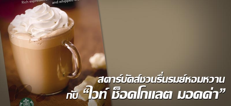 สตาร์บัคส์ คอฟฟี่ ไทยแลนด์ แนะนำความรื่นรมย์เพื่อมอบประสบการณ์สุดพิเศษในการดื่มให้กับลูกค้า กับความหอมหวานใหม่ ไวท์ ช็อคโกแลต มอคค่า (White Chocolate Mocha) เครื่องดื่มใหม่ล่าสุด ที่ผสานความหอมหวานนุ่มนวลของ ไวท์ ช็อคโกแลต เข้ากับนมและช็อตเอสเพรสโซ่อย่างลงตัว พร้อมปิดท้ายด้วยวิปครีมแสนนุ่ม