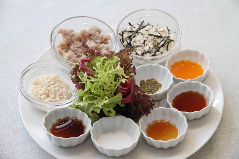 เนื้อปลาเทราท์ 180 กรัม (หาซื้อได้ตามร้านโครงการหลวง)/ซีอิ๊วขาว 15 กรัม/รากผักชีกระเทียมพริกไทย 4 กรัม/น้ำมันหอย 10 กรัม/น้ำตาลทราย 7 กรัม/น้ำมันงา 2 กรัม/ไข่แดง+ไข่ขาว 15 กรัม/ขนมปังป่น 15 กรัม+เกล็ดขนมปัง+ สาหร่ายทะเลหั่นฝอย