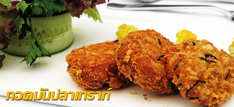 วิธีทำ : 1) นำเนื้อปลามาขูด (ไม่เอาหนัง) แล้วตีเนื้อปลาให้เข้ากันและมีความเหนียว 2) นำไปคลุกเคล้ากับส่วนผสมทุกอย่างให้เข้ากัน แล้วนำมาปั้นเป็นก้อน ก้อนละประมาณ 30 กรัม ได้ประมาณ 5-6 ก้อน 3) นำลงไปชุบกับไข่ แล้วค่อยนำไปคลุกกับเกล็ดขนมปังที่ผสมสาหร่ายทะเล 4) แล้วจึงนำลงทอดในน้ำมันพืชที่ตั้งไฟจนร้อน จนกระทั่งได้ทอดมันปลาเทราท์เหลืองสวยน่ารับประทาน ค่อยตักขึ้นและพักให้สะเด็ดน้ำมัน เสิร์ฟคู่กับผักสดๆจากโครงการหลวง จะอร่อยเลิศล้ำและไม่เลี่ยนด้วย