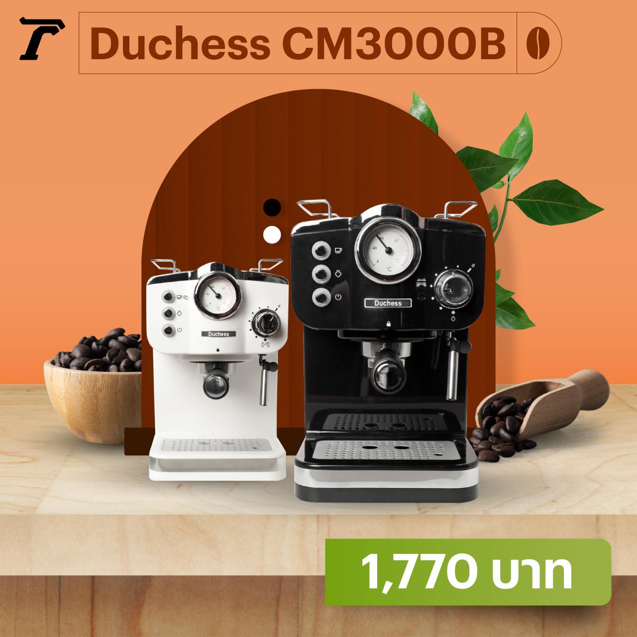 Duchess CM3000B ตัวเครื่องดูแข็งแรง เป็นเครื่องชงกาแฟสดแบบคันโยก เหมาะสำหรับการชงกาแฟ ช็อกโกแลต และเครื่องดื่มร้อน ใช้ระบบแรงดันน้ำ 15 บาร์ จุน้ำได้ 1.5 ลิตร