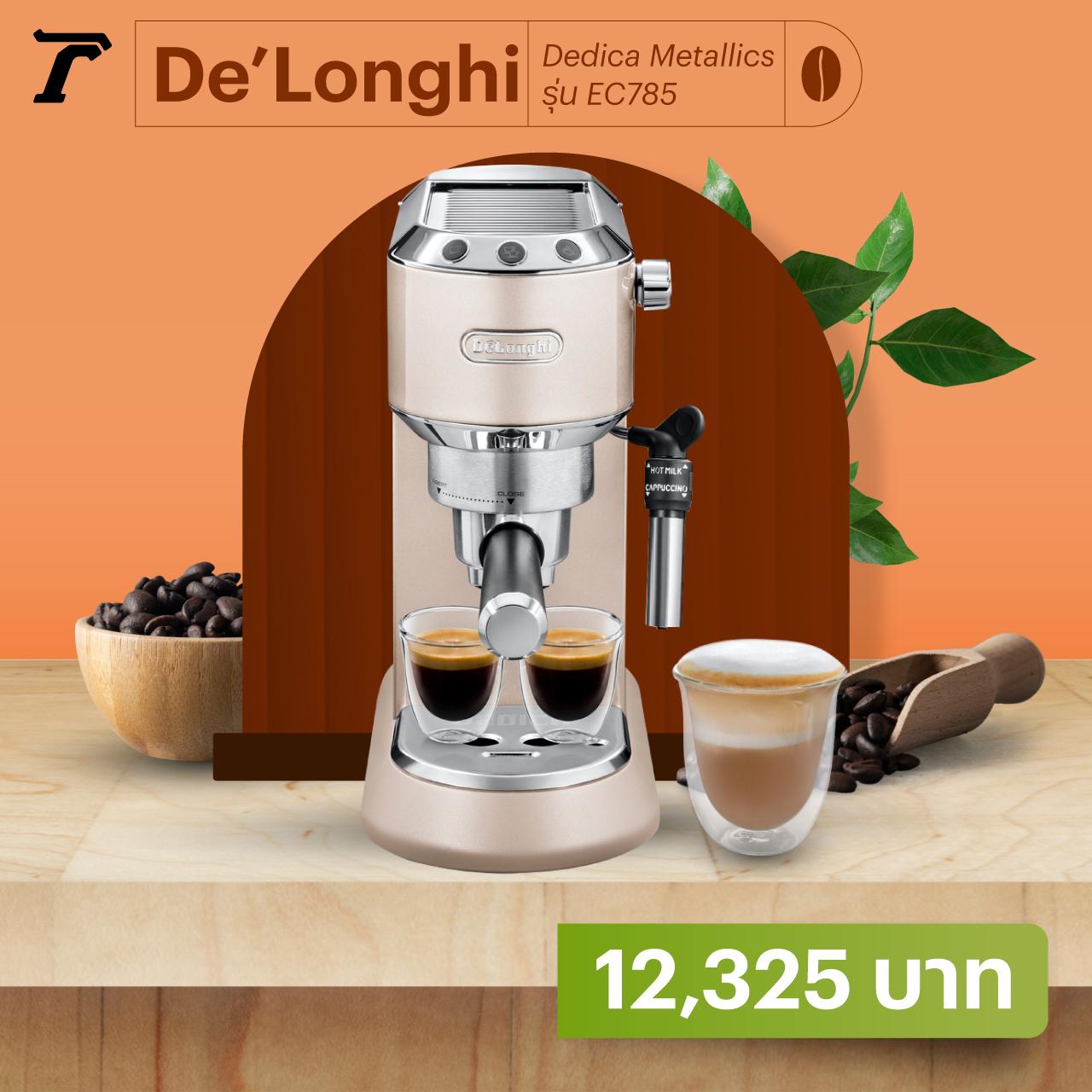 De'Longhi Dedica Metallics รุ่น EC785 เป็นเครื่องชงกาแฟเอสเพรสโซ่ นำเข้าจากประเทศอิตาลี ตัวเครื่องทำจากสเตนเลสอย่างดี ภายในบรรจุน้ำสำหรับทำกาแฟได้ครั้งละ 1.1 ลิตร และใช้แรงดันน้ำ 15 บาร์ ชงได้ทั้งกาแฟผงและ POD มีตัวทำฟองนมสำหรับทำเมนูคาปูชิโน่ เหมาะสำหรับโรงแรม ที่พัก และออฟฟิศ