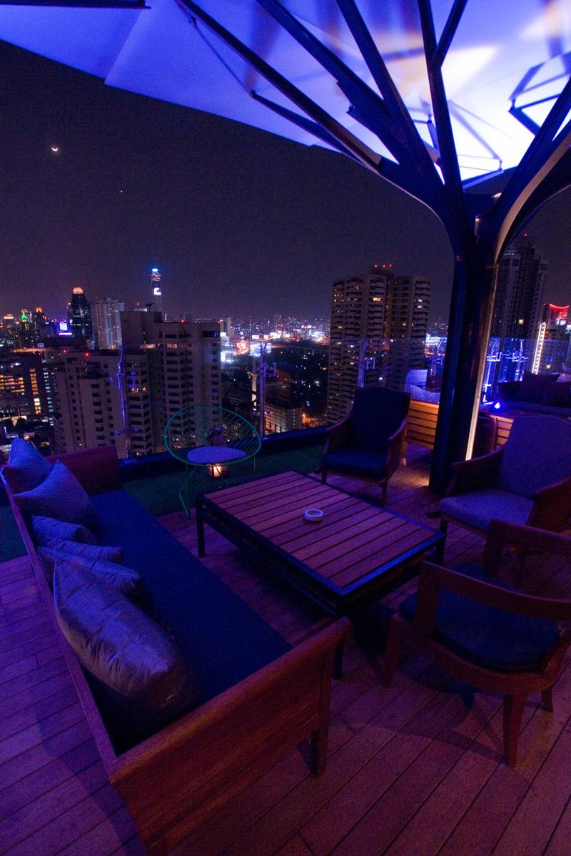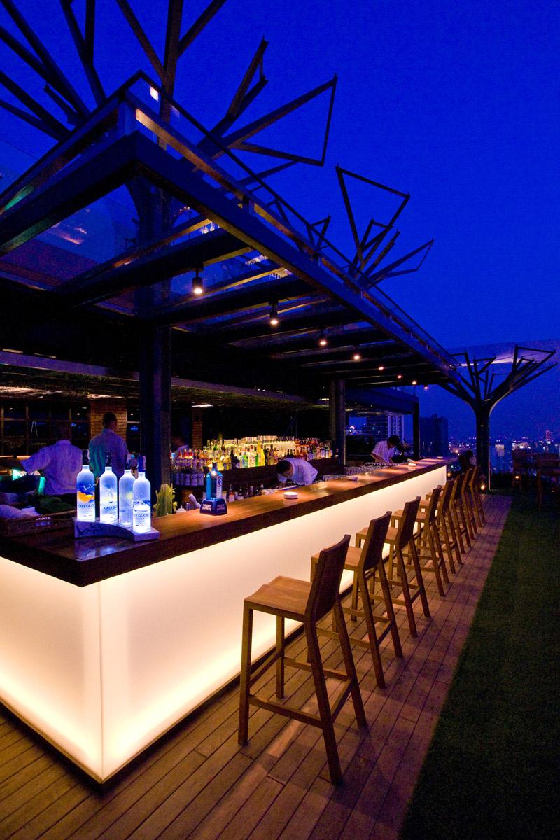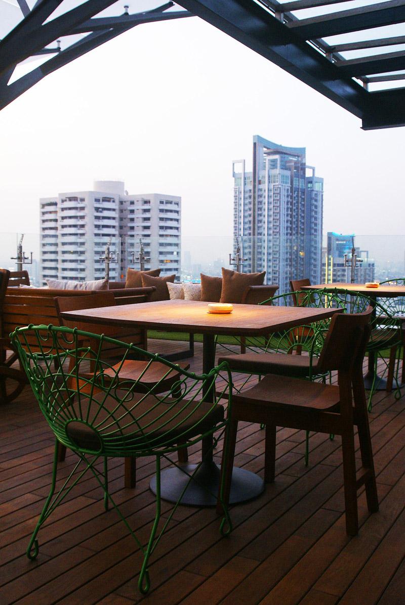 ในส่วนของบรรยากาศร้าน ที่นี่เน้นการสร้างความเป็นธรรมชาติ ตกแต่งให้ได้บรรยากาศแบบสวนหย่อมเล็กๆ เหมือนไม่ได้อยู่ใจกลางเมือง โดยร้านตั้งอยู่บนชั้น 33 ของโรงแรมฯ สามารถมองเห็นวิวของกรุงเทพฯ ในมุมสูง ตกแต่งด้วยหญ้าเทียมให้ร้านดูสดชื่นขึ้น รวมทั้งเฟอร์นิเจอร์ที่ใช้เน้นวัสดุทำจากไม้เป็นหลัก แต่เป็นในสไตล์โมเดิร์น ทั้งโต๊ะ เก้าอี้ เดย์เบด ไว้เอนกาย สังสรรค์กับเพื่อนฝูง พร้อมกับการฟังเพลงเปิดแผ่นจากดีเจ