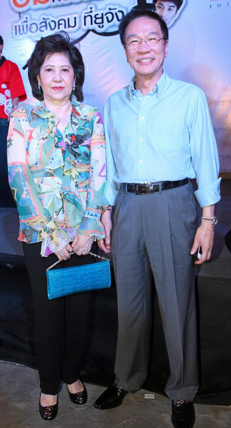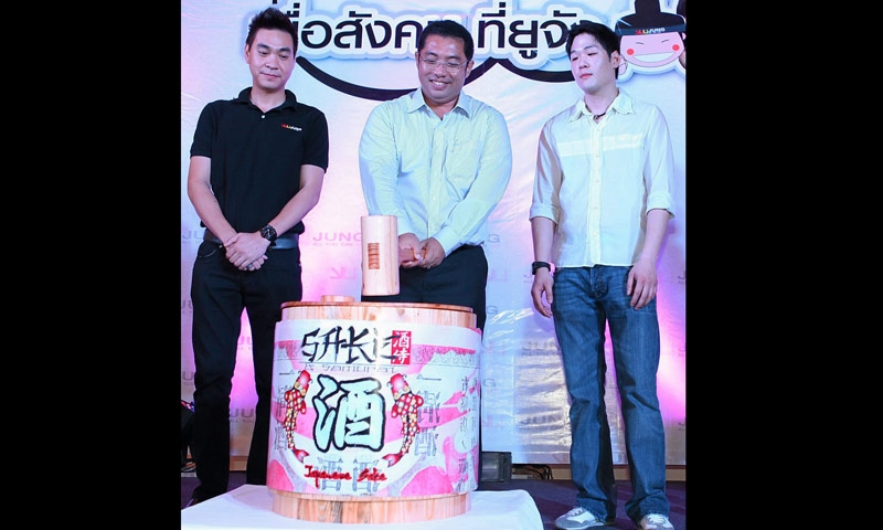 สนธยา คุณปลื้ม (กลาง) ทุบถังสาเกเป็นประเพณีของการเปิดร้าน ให้กับวิศว ศรีรัตนประภาส (ซ้ายสุด) ผู้บริหาร ยู จัง และวุฒิศักดิ์ อินทรภูวศักดิ์ ผู้บริหารอินท์–อินเตอร์เซค.