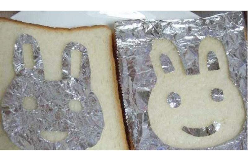 1. ออกแบบลวดลายที่อยากได้ลงบนกระดาษฟอยล์ จากนั้นตัดชิ้นส่วนต่างๆ ไปวางบนแผ่นขนมปัง ควรกดเล็กน้อยให้แผ่นฟอยล์ติดกับขนมปัง (กระดาษฟอยล์วางบนส่วนไหนของขนมปัง ส่วนนั้นจะไม่มีสีน้ำตาลเกรียม)