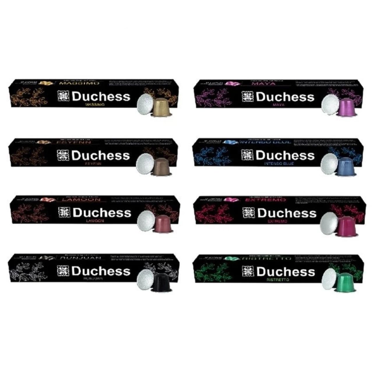 กาแฟแคปซูลจาก Duchess แบรนด์เครื่องชงกาแฟสัญชาติไทย กาแฟใช้เมล็ดอาราบิก้าและโรบัสต้า มีทั้งเมล็ดพันธ์ุที่ปลูกในไทยและเมล็ดกาแฟพรีเมียมจากต่างประเทศ มีความเข้มและความเปรี้ยวให้เลือกหลายระดับ รวมแล้วกว่า 15 รสชาติด้วยกัน