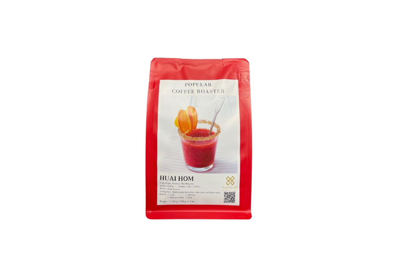 เมล็ดกาแฟ Popular Coffee Roasters กลิ่น Huai Hom Mae Hong Son เมล็ดกาแฟคั่วกลางจากหมู่บ้านห้วยห้อม จังหวัดแม่ฮ่องสอน มอบรสชาติเฉพาะตัวที่ให้ความสดชื่นจากผลไม้สุกสีแดง ที่มีความเปรี้ยวเล็กน้อยผสมเข้ากับความขมอ่อนๆ เเละกลิ่นหอมของน้ำตาลบราวน์ชูการ์ มีให้เลือกหลากหลายระดับไม่ว่าจะเป็นกาแฟคั่วบด, กาแฟคั่วกลาง, กาแฟคั่วกลางไปทางเข้ม เเละกาแฟคั่วแบบเข้ม