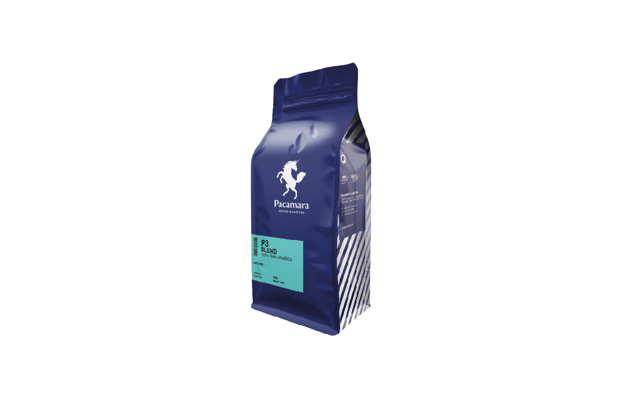 เมล็ดกาแฟ Pacamara กลิ่น P3 Blend เมล็ดกาแฟอาราบิก้าสายพันธุ์ไทย คั่วเข้ม โดดเด่นด้วยความเข้มข้นของรสชาติขมจากกาแฟ ก่อนจะตามมาด้วยกลิ่นเเละรสชาติหอมอ่อนๆ จากดาร์กช็อกโกแลต ให้ความรู้สึกนุ่มลึกและมีรสสัมผัสที่ยาวนาน สามารถนำมารังสรรค์เป็นเมนูเอสเพรสโซ่เเละนำมาผสมนมให้กลายเป็นกาแฟนมก็ยิ่งส่งเสริมรสชาติให้อร่อยมากขึ้น