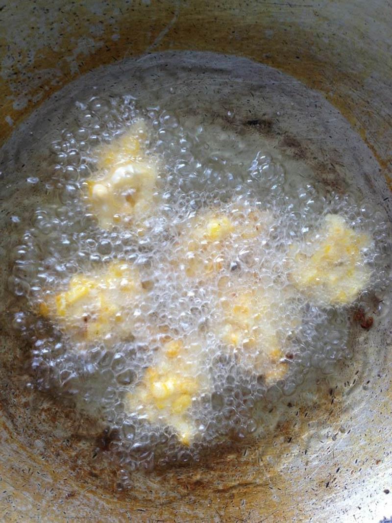 5. ตั้งกระทะใส่น้ำมันให้ร้อน เมื่อน้ำมันเริ่มร้อนแล้วให้หรี่ไฟลงอ่อน จากนั้นใช้ช้อนตักข้าวโพดให้ขนาดกำลังดี แล้วค่อยๆ หย่อนลงกระทะ