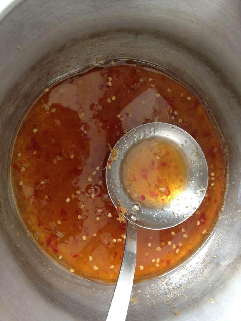 1. เทน้ำจิ้มไก่ใส่หม้อต้ม ใส่น้ำเปล่าสัก 1 ส่วน 4 ถ้วย จากนั้นตั้งไฟเคี่ยวไปเรื่อยๆ