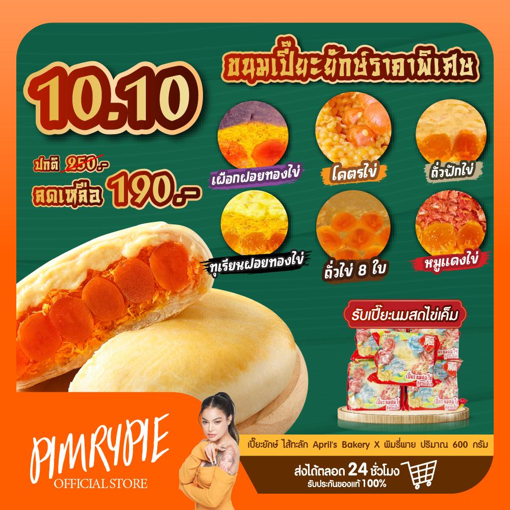 ขนมเปี๊ยะไส้ทะลัก ร้าน April's Bakery ขนมเปี๊ยะไซส์ยักษ์น้ำหนัก 600 กรัม แป้งเหนียวนุ่ม หอมอร่อย ไส้แน่น มีให้เลือกทั้งหมด 6 ไส้ตามความชอบ ได้แก่ ไส้เผือกฝอยทองไข่, ไส้ทุเรียนฝอยทองไข่, ไส้ถั่วเหลืองไข่ 8 ใบ, ไส้โคตรไข่, ไส้ถั่วฟักไข่ และไส้หมูแดงไข่ บรรจุภัณฑ์สวยงามจะซื้อไปกินเอง หรือซื้อไปเป็นของฝากก็ได้
