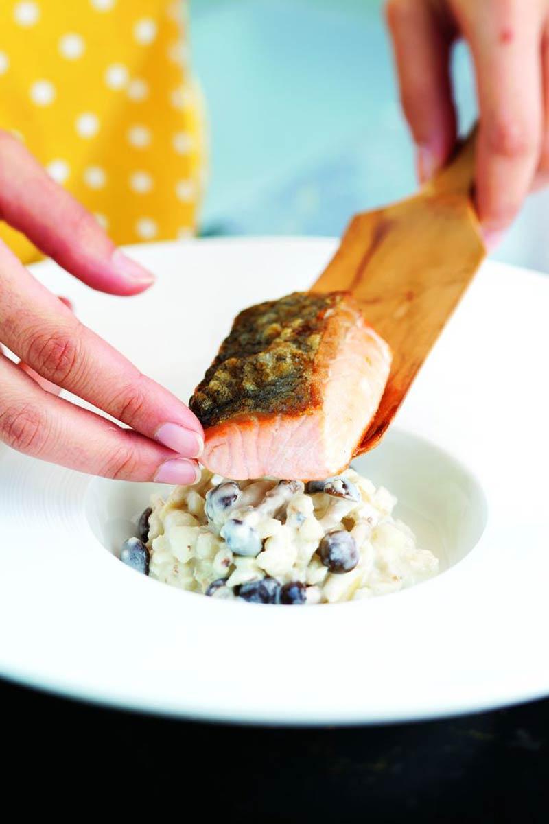 1. โรยเกลือและพริกไทยบนชิ้นปลาให้ทั่ว เคล้ากับน้ำมันมะกอกแล้วนำไปย่างบนกระทะจนสุกเหลือง พักไว้