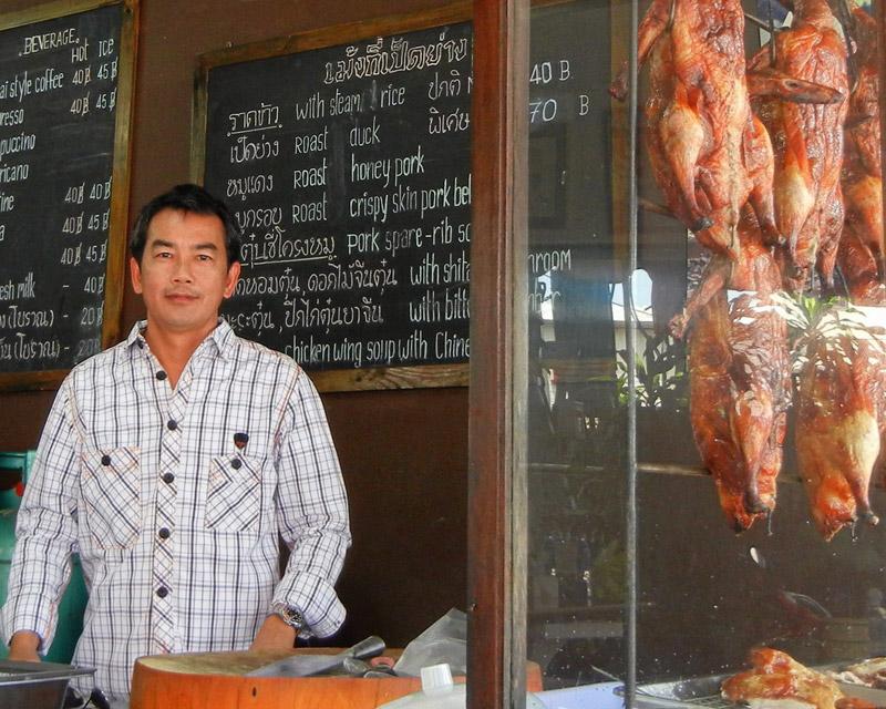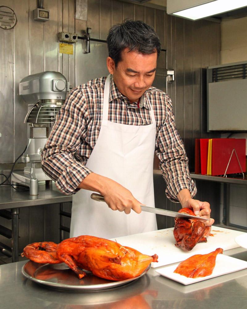 หลายคนที่ชอบทานเป็ดย่าง คงอยากต่อยอดเอาเนื้อเป็ดไปทำอะไรได้อีก? เชฟวิชิต มุกุระ เชฟคนดังแห่งห้องอาหารศาลาริมน้ำ โรงแรมแมนดาริน โอเรียนเต็ล เจ้าของ ไอเดีย Chef’s table ที่เปิดครัวให้ลูกค้านักชิมเข้ามานั่งลิ้มรสอาหารไทยฝีมือของเขาถึงหน้าเตาเลย มีเมนูส่วนตัวที่ไม่ได้เสิร์ฟที่ไหน นอกจากทำกินส่วนตัวมานำเสนอไม่เพียงเป็นเชฟใหญ่ครัวไทยของรร.ดังเท่านั้น เชฟวิชิตยังเป็นเจ้าของร้านอาหารประเภทจีน-ไทย “เม้งกี่” ที่บ้านเกิดเมืองพัทยา (บนถนนพัทยา-นาเกลือ) มานานกว่า 25 ปีแล้ว โดยเล่าให้ฟังว่า คุณพ่อไปร่วมหุ้นกับเพื่อนชาวฮ่องกง แต่พอทำได้สักพักเพื่อน ชาวฮ่องกงก็ถอนทุนคืนเพื่อกลับบ้านแต่คุณพ่ออยากเก็บร้านนี้ไว้ทำต่อ เลยเรียกผมซึ่งตอนนั้นทำงานอยู่ที่โรงแรมฮิลตันให้มาสานต่อ ผมช่วยอยู่ปีกว่า ก็กลับมาทำงานโรงแรมตามเดิม เริ่มแรกที่ร้านจะมีเฉพาะข้าวกับบะหมี่เป็ดย่าง หมูแดง หมูกรอบ เท่านั้น แต่ 10 ปีให้หลังมานี้ ผมได้เพิ่มเมนูอาหารไทยเข้าไปด้วย อาทิ แกงเขียวหวาน แกงพะแนง ไข่พะโล้ และข้าวคลุกกะปิ เพื่อจะได้มีเมนูหลากหลายให้ลูกค้าได้เลือก เชฟวิชิตยังเล่าต่ออีกว่า เขาเป็นคนที่ชอบทานอาหารไทย และเน้นสมุนไพรไทยเยอะๆด้วย จึงมักจะเอาเนื้อเป็ดที่ร้านมาทำ “ผัดฉ่าเป็ดย่าง” อยู่เสมอ และสมุนไพรก็ไม่ต้องไปหาซื้อในตลาด เก็บจากแปลงผักสวนครัวหลังบ้านมาปรุงได้เลย