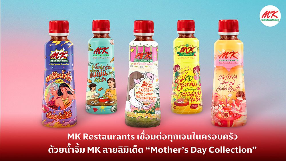 สำหรับไฮไลต์ของการแจกน้ำจิ้มสุกี้ MK สูตรต้นตำรับในครั้งนี้คือการออกแบบลายขวด “Mother’s Day Collection” จำนวน 5 ลาย จากศิลปินรุ่นใหม่ในธีม “แม่คือน้ำจิ้มของบ้าน” เพราะ MK เชื่อว่า “บ้าน” คือ “หม้อสุกี้” และ “แม่” ก็คือ “น้ำจิ้ม” ที่ทำให้ทุกอย่างกลมกล่อม เข้ากัน และน่าอยู่ พร้อมถ่ายทอดความรัก และส่งต่อความรู้สึกดีๆ ให้กับทุกครอบครัว สะท้อนให้เห็นถึงภาพจำที่นึกถึงแม่ๆ ของแต่ละบ้านได้อย่างชัดเจน