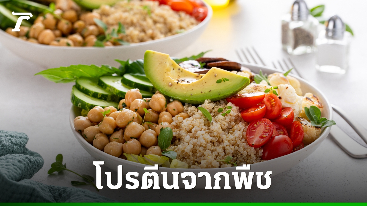 ส่วนโปรตีนจากพืช หรือ Plant-based protein ก็จัดว่าเป็นแหล่งโปรตีนที่ดี แต่มีกรดอะมิโนจำเป็นไม่ครบถ้วนเท่ากับเนื้อสัตว์ สามารถพบได้ในถั่วเขียว ถั่วแดง ลูกเดือย ข้าวโอ๊ต ควินัว ผักโขม อัลมอนด์ ถั่วดำ เมล็ดเจีย ถั่วลูกไก่ ถั่วลันเตา ผักคะน้า เมล็ดฟักทอง ถั่วเหลืองและผลิตภัณฑ์ เช่น เต้าหู้ โปรตีนเกษตร