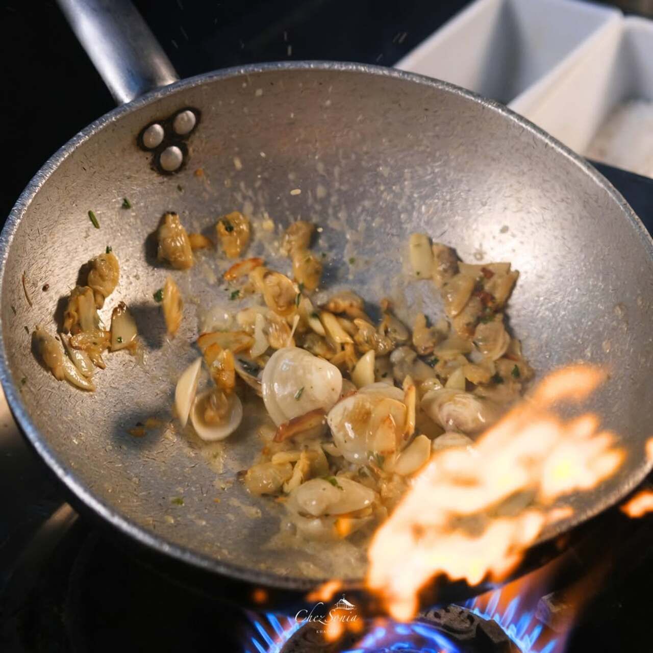 หัวใจของจานนี้คือเส้นพาสต้าที่ลวกมาอย่างสมบูรณ์แบบในระดับ "อัลเดนเต้" (al dente) คลุกเคล้าในซอสที่ผัดจนหอมกรุ่นด้วยกระเทียม พริกแห้ง และน้ำมันมะกอกคุณภาพเยี่ยม ก่อนจะอัดแน่นด้วยวัตถุดิบจากท้องทะเล ทั้งหอยตลับสดใหม่และปลาหมึกเนื้อเด้ง แต่กุญแจสำคัญที่ทำให้จานนี้แตกต่างคือการเสริมมิติความเค็มลึกด้วย แองโชวี่ (ปลาเค็มอิตาลี) ที่ช่วยขับรสชาติของซีฟู้ดทั้งหมดให้โดดเด่น ผลลัพธ์ที่ได้คือพาสต้ารสชาติเข้มข้น กลมกล่อม หอมกลิ่นอายทะเล และมีความเผ็ดร้อนกำลังดี เป็นรสชาติที่ออกแบบมาเพื่อคนเอเชียโดยเฉพาะ