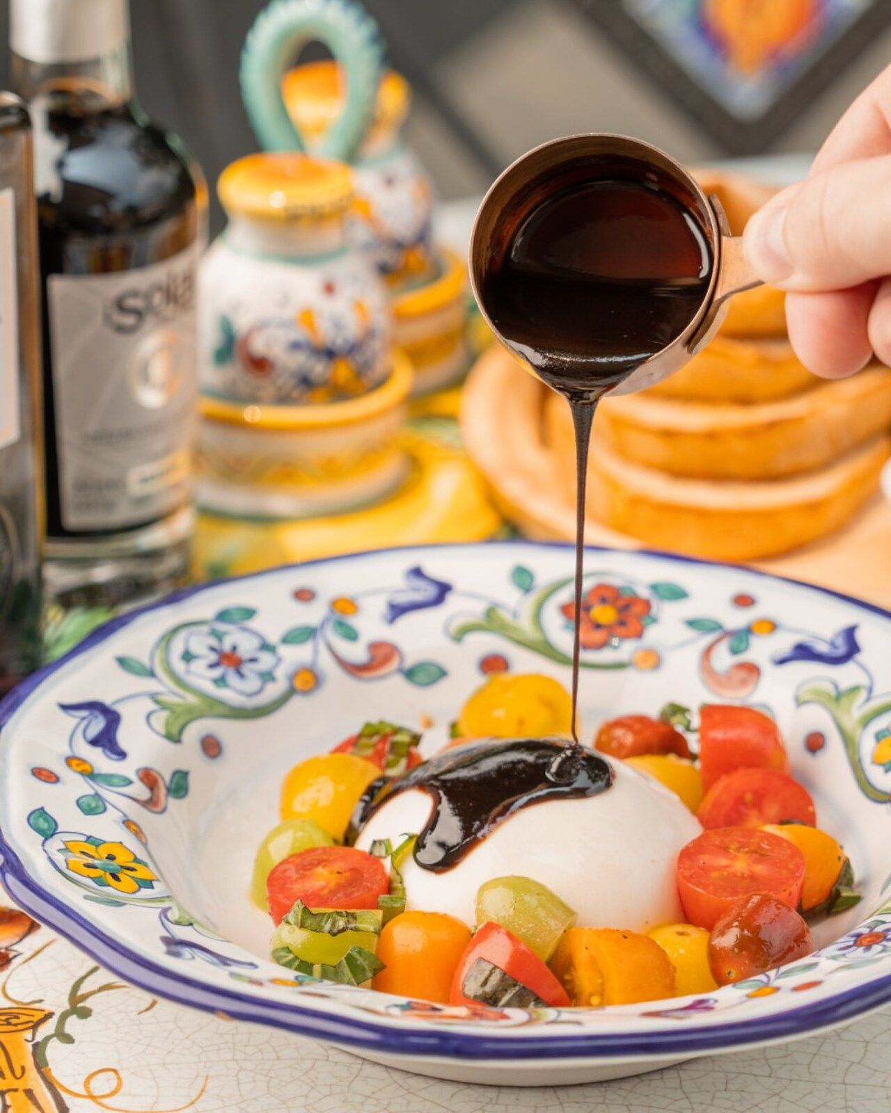 บูร์ราต้า สลัด (Burrata Salad) ความสดชื่นกับบูร์ราต้าชีสก้อนขาวนวลที่ทำจากนมควาย ให้ความหอมมันและเข้มข้นกว่าชีสจากนมวัวทั่วไป เสิร์ฟบนสลัดมะเขือเทศสดฉ่ำ ปรุงรสอย่างเรียบง่ายแต่ลงตัวด้วยซอสบัลซามิก เกลือ พริกไทย และน้ำมันมะกอก