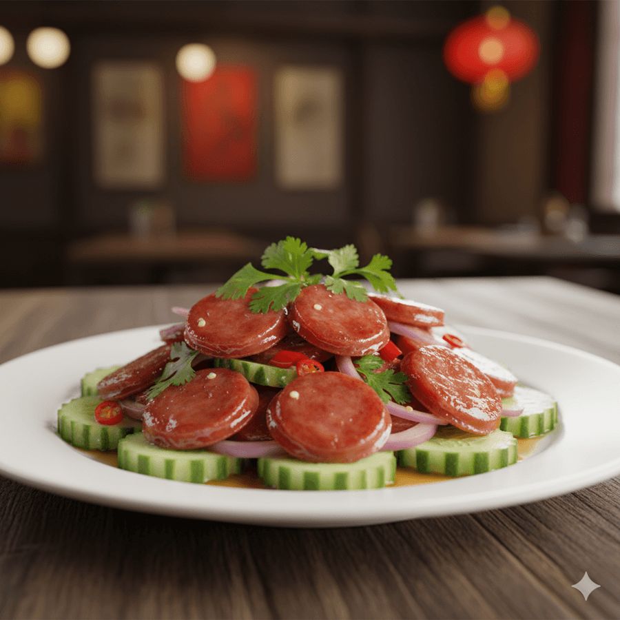 - ใส่พริกซอย หอมแดงซอย ลงในน้ำยำ ตามด้วยกุนเชียงทอด แตงกวา และขึ้นฉ่าย คลุกเคล้าให้เข้ากันเบาๆ