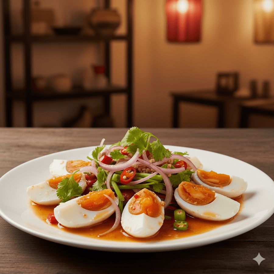 - ตักน้ำยำราดลงบนไข่เค็มที่จัดจานไว้ โรยด้วยขึ้นฉ่าย/ต้นหอม พร้อมรับประทาน