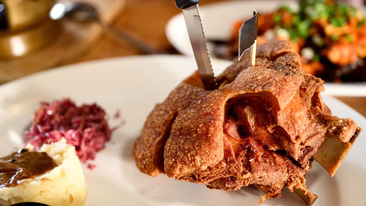 เมื่อขาหมูของเราได้ที่แล้ว ก็ถึงเวลาแห่งความสุข สับขาหมูเป็นชิ้นพอดีคำ จัดเรียงใส่จาน เสิร์ฟร้อนๆ คู่กับมันบดเนื้อเนียนนุ่ม กะหล่ำปลีดองรสเปรี้ยวอมหวานเพื่อตัดเลี่ยน และมัสตาร์ดรสเข้มข้น หรือจะจิ้มกับน้ำจิ้มซีฟู้ดรสเด็ดแบบไทยๆ ก็เข้ากันอย่างไม่น่าเชื่อ