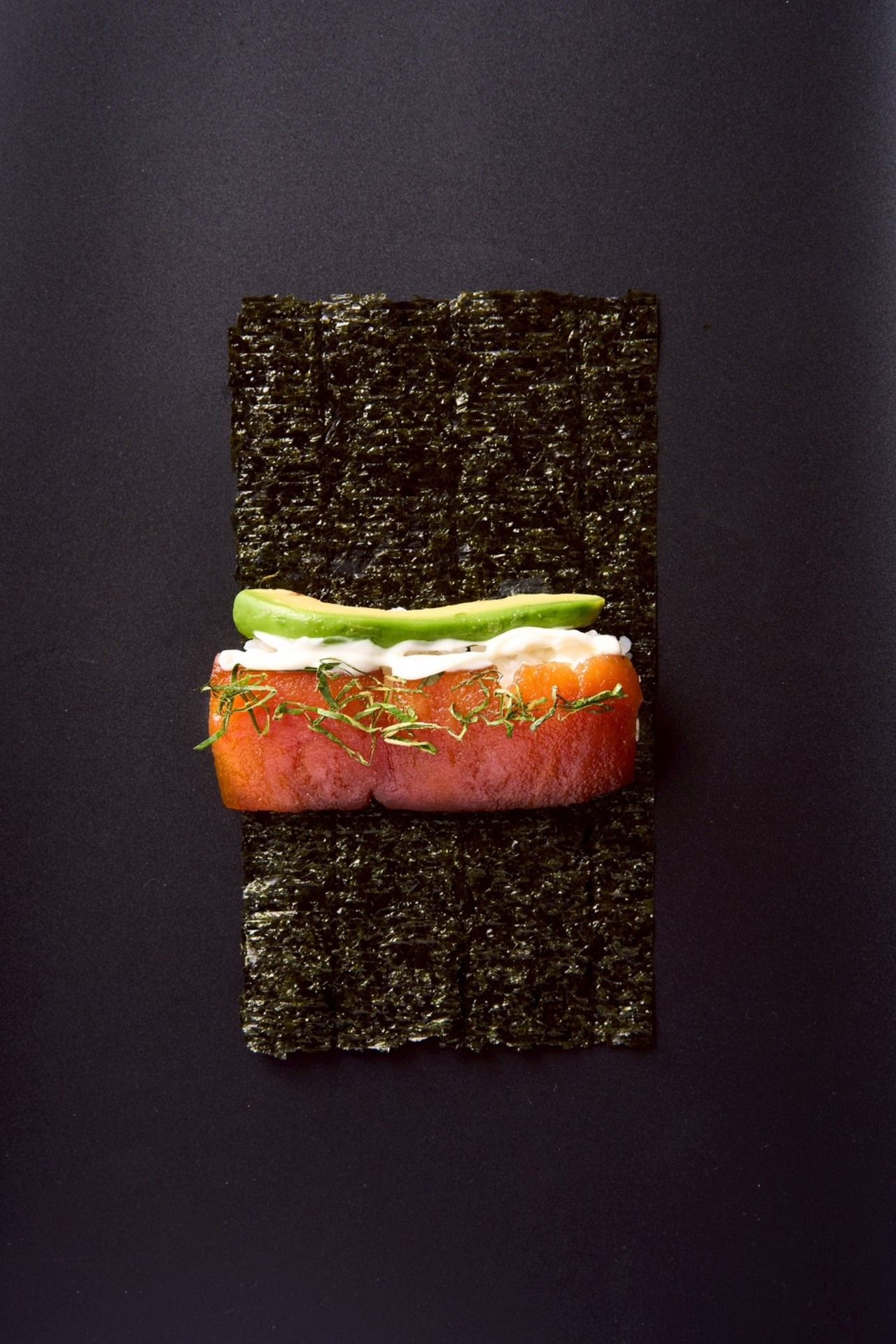 โรลมะเขือเทศอากามิ: เป็นการตีความใหม่ที่น่าสนใจ โดยใช้มะเขือเทศที่ผ่านการปรุงอย่างพิถีพิถันจนได้เนื้อสัมผัสที่นุ่มนวลคล้ายเนื้อปลาทูน่า เพิ่มความหอมที่เป็นเอกลักษณ์ด้วยใบโอบะ ทำให้เป็นคำที่ทั้งเบาสบายและซับซ้อนในเวลาเดียวกัน