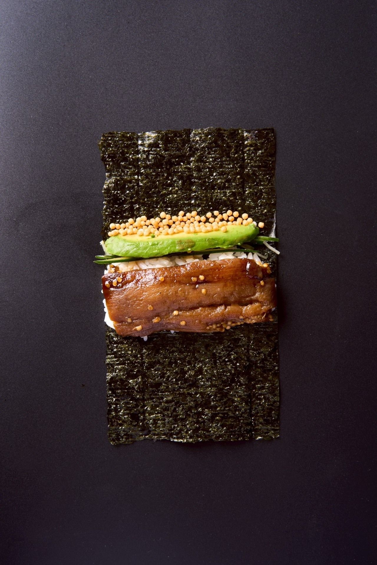โรลมะเขือม่วงเทอริยากิ: ไฮไลต์ที่น่าจับตามอง คือการนำมะเขือม่วงมาย่างกับซอสเทอริยากิจนได้รสชาติที่เข้มข้น คล้ายกับปลาไหลย่างที่หลายคนคุ้นเคย ตัดด้วยความสดชื่นของแตงกวาญี่ปุ่นอย่างลงตัว