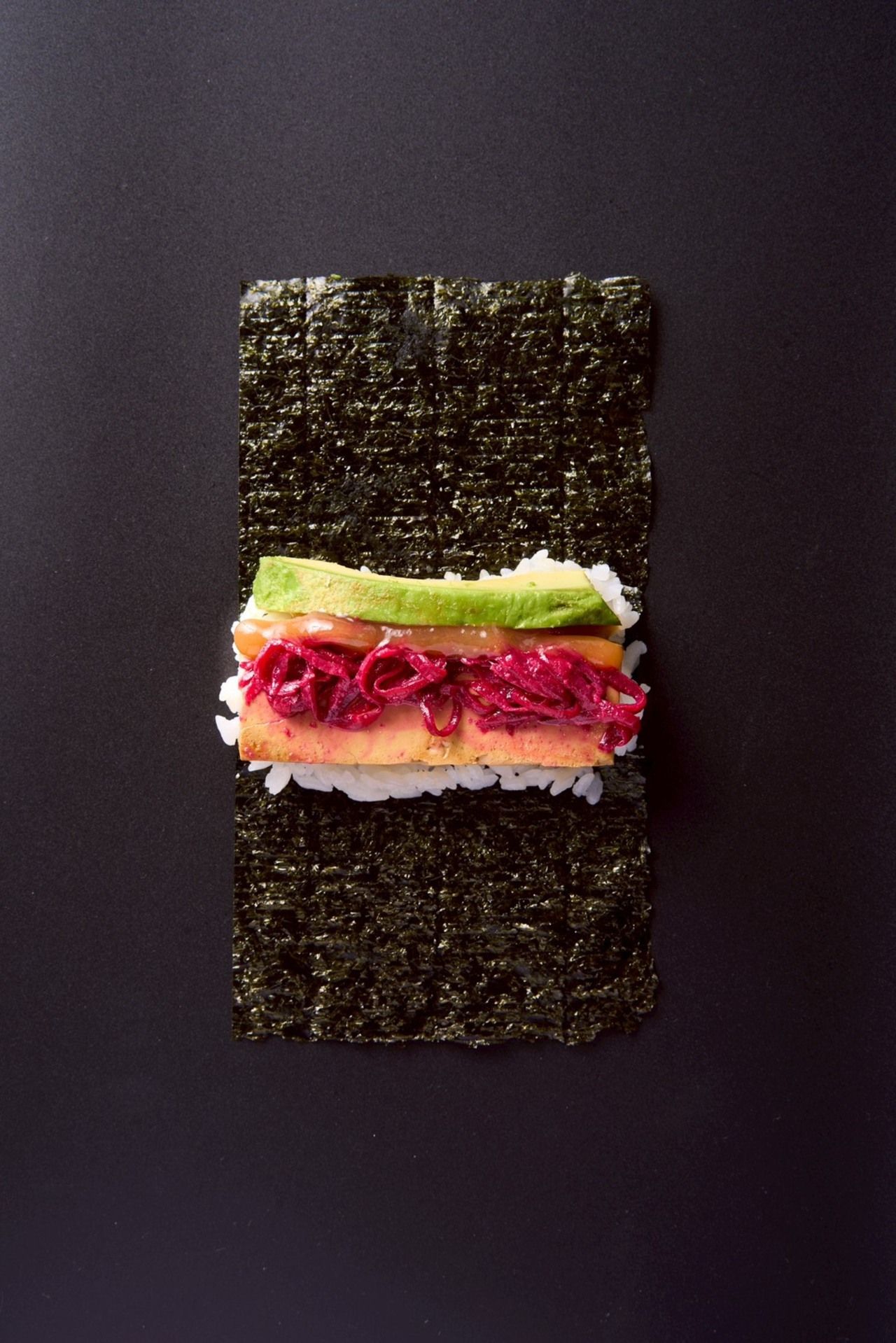 โรลเต้าหู้ยูซุบีทรูท: เริ่มต้นความสดชื่นด้วยโปรตีนจากเต้าหู้ เพิ่มมิติด้วยความเปรี้ยวอมหวานของส้มยูซุ และความกรอบของบีทรูท เป็นคำที่ช่วยเปิดต่อมรับรสได้เป็นอย่างดี