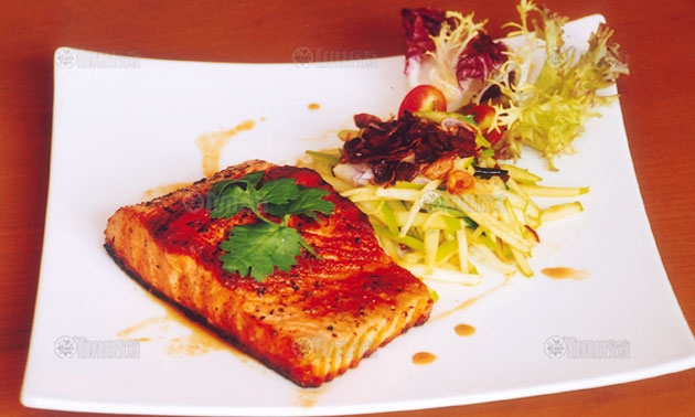 วิธีทำ 1) ล้างปลาแซลมอนให้สะอาด ซับน้ำให้แห้ง แล้วเคล้าเกลือและพริกไทยให้ทั่ว หมักไว้สักครู่ 2) ผสมน้ำปลา น้ำตาลปี๊บ และน้ำมะขามเปียก ตั้งไฟเคี่ยวให้น้ำตาลละลาย ชิมให้ได้ทั้ง 3 รส แล้วพักไว้ให้ เย็น 3) คลุกแอปเปิ้ลเขียวกับหอมแดงซอย ผักชีซอย พริกแห้งทอด หอมเจียวให้เข้ากัน แล้วราดน้ำปลาหวานที่เคี่ยวไว้ คลุกเคล้าให้เข้ากัน 4) ตั้งกระทะย่างบนเตา และทาน้ำมันมะกอกบางๆให้ทั่ว เปิดไฟกลางให้กระทะร้อน จึงนำปลาลงย่าง โดยเอาด้านหนังลงย่างก่อน ประมาณ 3-4 นาที แล้วกลับด้าน ย่างต่ออีก 3-4 นาที แต่อย่าย่างนานเพราะจะทำให้เนื้อปลาแข็งไม่อร่อย เมื่อสุกดีแล้วนำวางในจาน 5) ตักน้ำปลาหวานแอป–เปิ้ลที่คลุกไว้วางข้างๆปลาย่าง โรย หน้าด้วยหอมเจียวและเบคอนทอดกรอบให้ดูสวยงาม อาจเสิร์ฟพร้อมสลัดผักซักจาน.....เพียงแค่นี้ก็อิ่มเบาๆ แต่ได้คุณประโยชน์เพียบ.